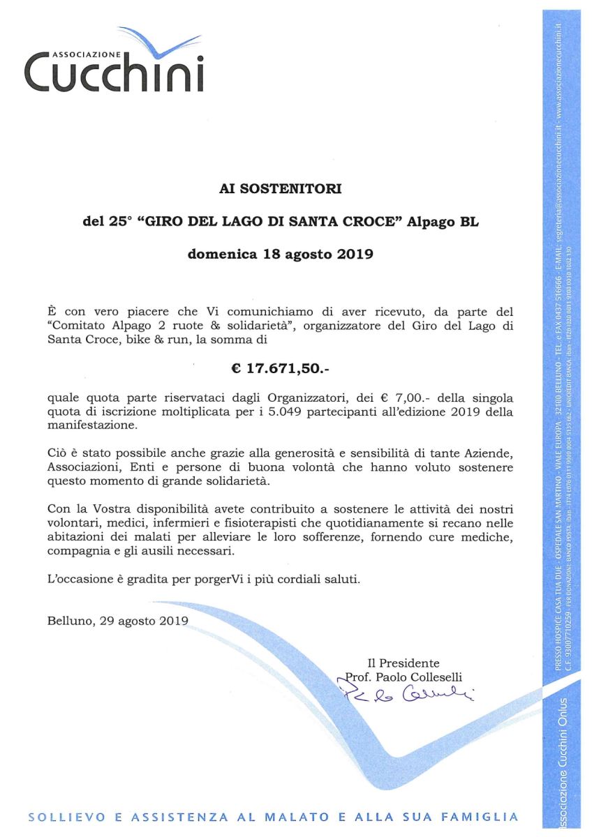 L’edizione 2019 del Giro del Lago di Santa Croce ha consentito di versare la cifra di 17.671,50 euro all’associazione “Cucchini” di Belluno.