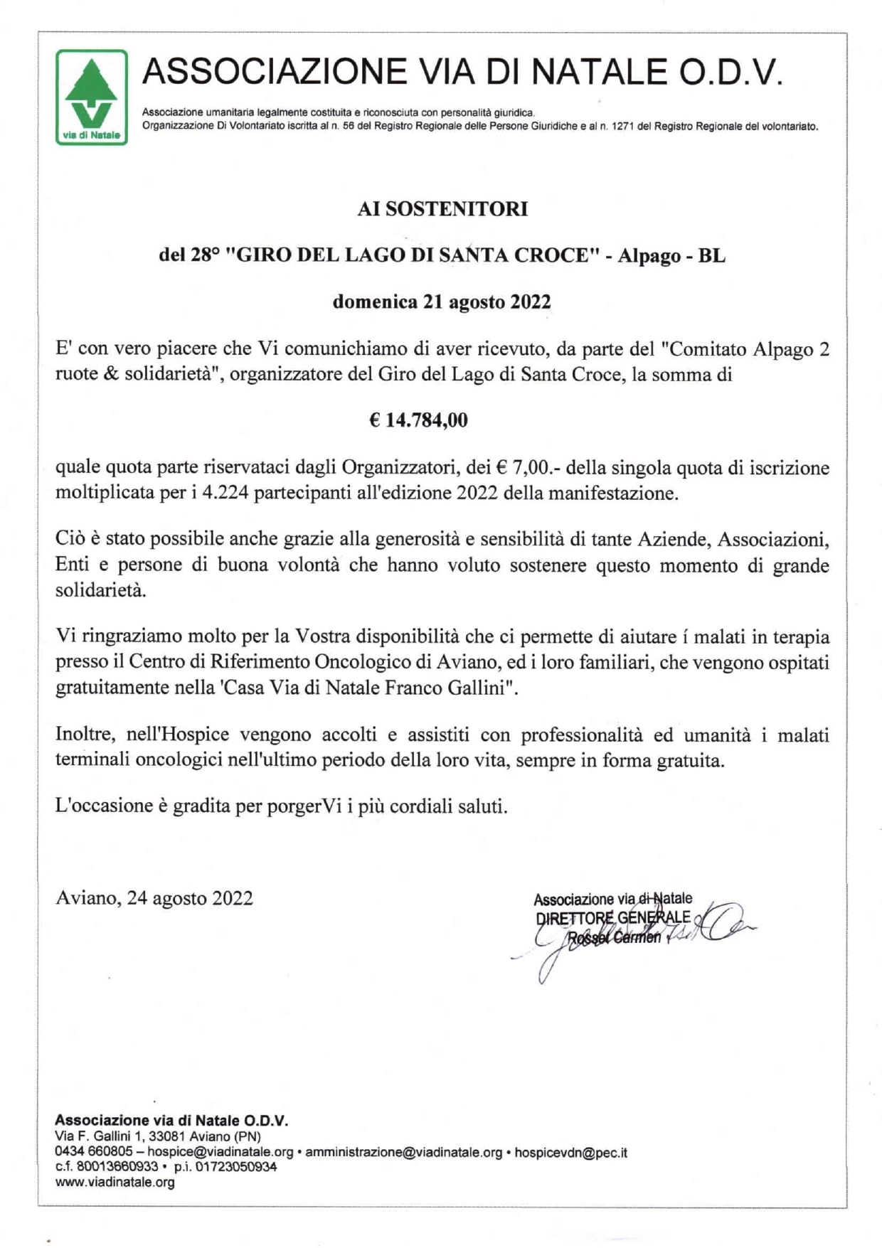 L’edizione 2022 del Giro del Lago di Santa Croce ha consentito di versare la cifra di 14,784,00 euro all’associazione “Via di Natale” di Aviano.