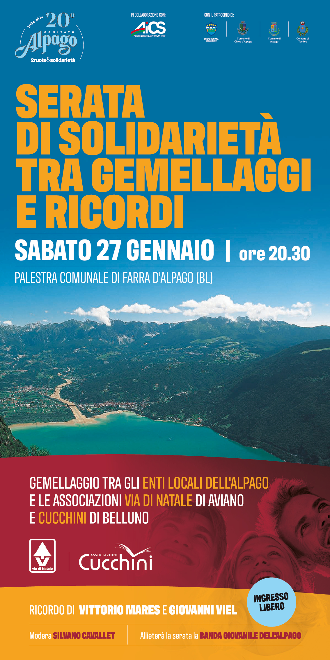 Sabato, 27 gennaio, il Comitato Alpago 2 Ruote & Solidarietà proporrà una “Serata di solidarietà, tra gemellaggi e ricordi”. Gemellaggi: verranno rinnovati i gemellaggi con le due realtà a favore delle quali va il ricavato del Giro del Lago, vale a dire la Via di Natale di Aviano (realtà pordenonese che dà assistenza ai malati terminali oncologici dell’ “Hospice Via di Natale” e ospitalità gratuita ai familiari dei malati ricoverati al Cro di Aviano ed ai pazienti oncologici in terapia ambulatoriale presso lo stesso Istituto), e l’Associazione Cucchini di Belluno (realtà che fornisce assistenza ai malati gravi e ai loro familiari a domicilio o presso l’Hospice Casa Tua Due dell’Ospedale San Martino di Belluno).