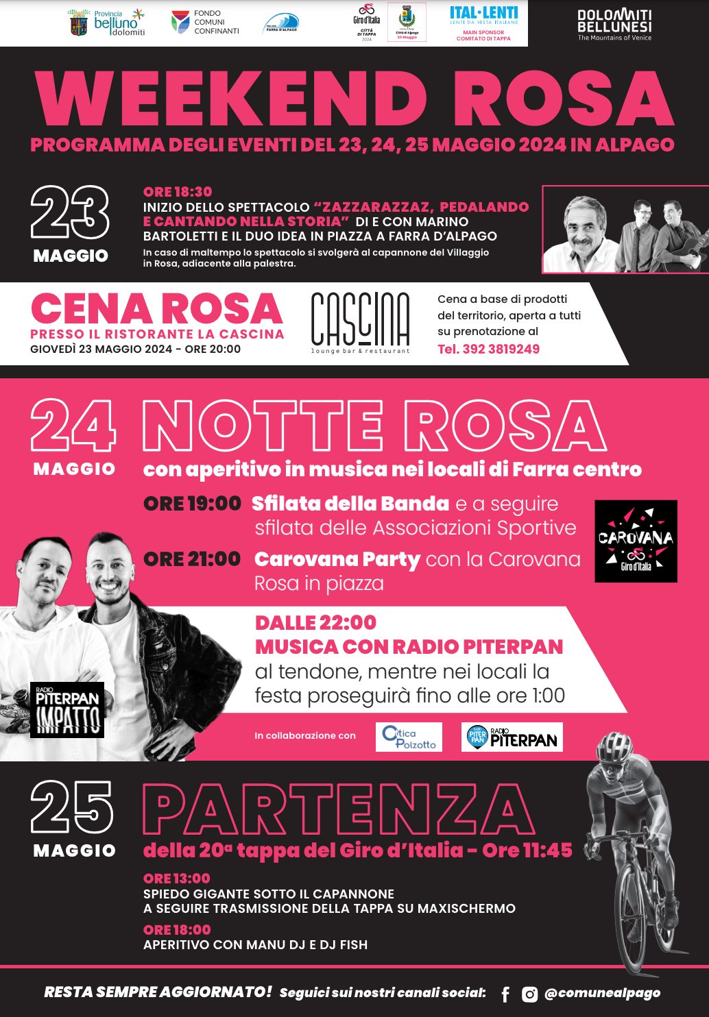 Giornate clou. Il coordinatore del comitato tappa, Enrico De Bona, ha evidenziato il calendario eventi dell’ultima settimana: «giovedì, 23 maggio, in piazza a Farra andrà in scena “Pedalando e cantando nella storia”, spettacolo di e con Marino Bartoletti. Nella stessa serata, cena solidale alla Cascina» ha spiegato De Bona, «Il clou sarà, naturalmente, tra 24 e 25 maggio. Venerdì 24 la Notte Rosa prenderà il via alle 19 con la sfilata della banda, cui seguirà la sfilata delle associazioni sportive. Di particolare rilievo, poi, il Carovana Party: siamo onorati che il Giro abbia scelto l’Alpago come una delle cinque sedi di questo spettacolo. Dalle 22, musica con Radio PiterPan al tendone. Il 25 la partenza della tappa, alle 11.45, e poi maxi spiedo e maxi schermo per vedere tutti insieme una delle frazioni più spettacolari del Giro».