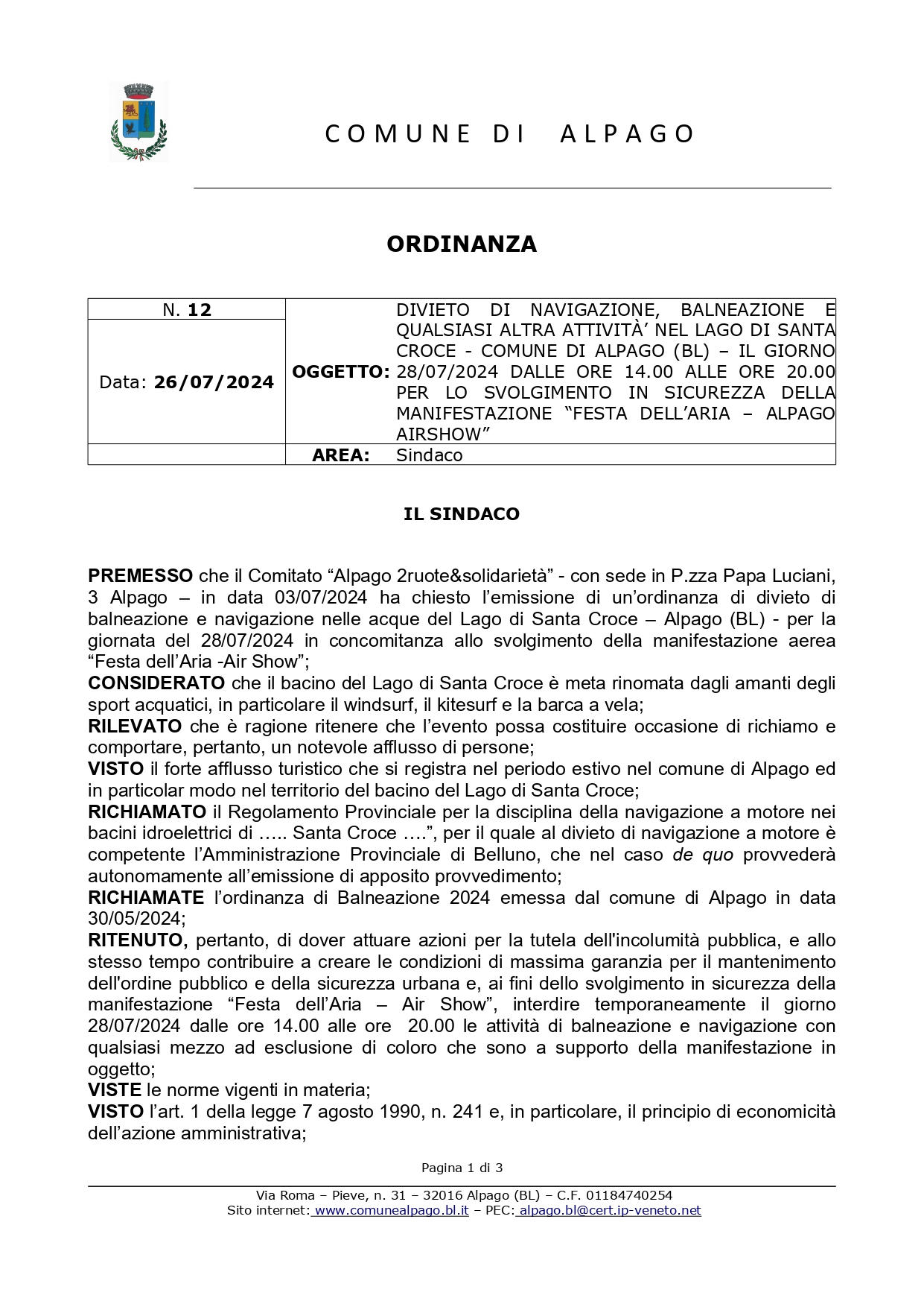 ALPAGO AIRSHOW: ORDINANZA DIVIETO NAVIGAZIONE E BALNEAZIONE SUL LAGO DI SANTA CROCE