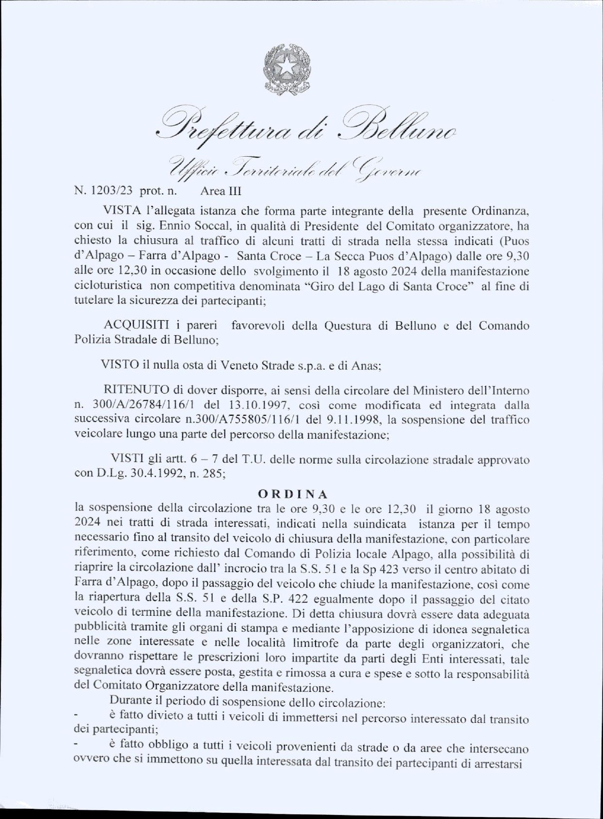 /  2024   /  Chiusura totale del traffico per il Giro del Lago: l’ordinanza della Prefettura