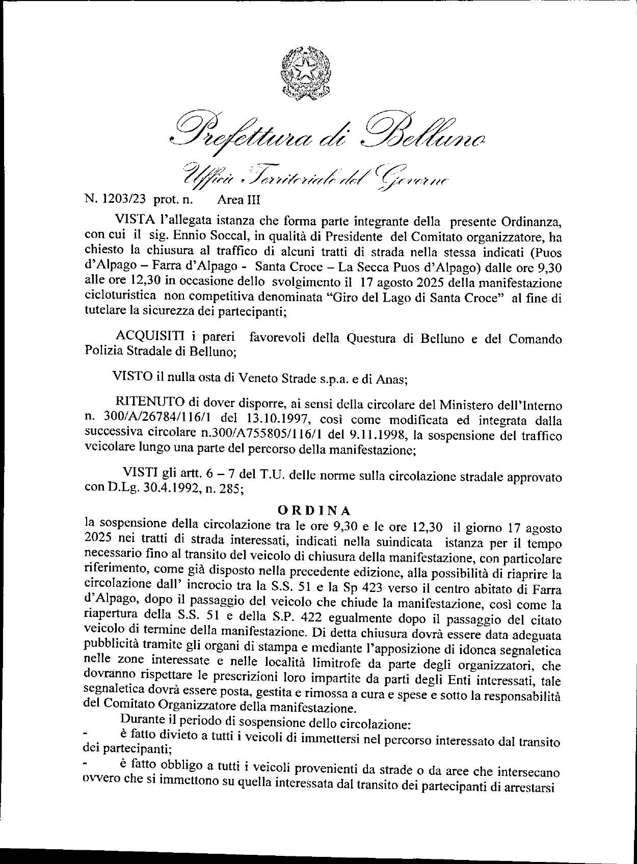 /  2025   /  Chiusura totale del traffico per il Giro del Lago: l’ordinanza della Prefettura