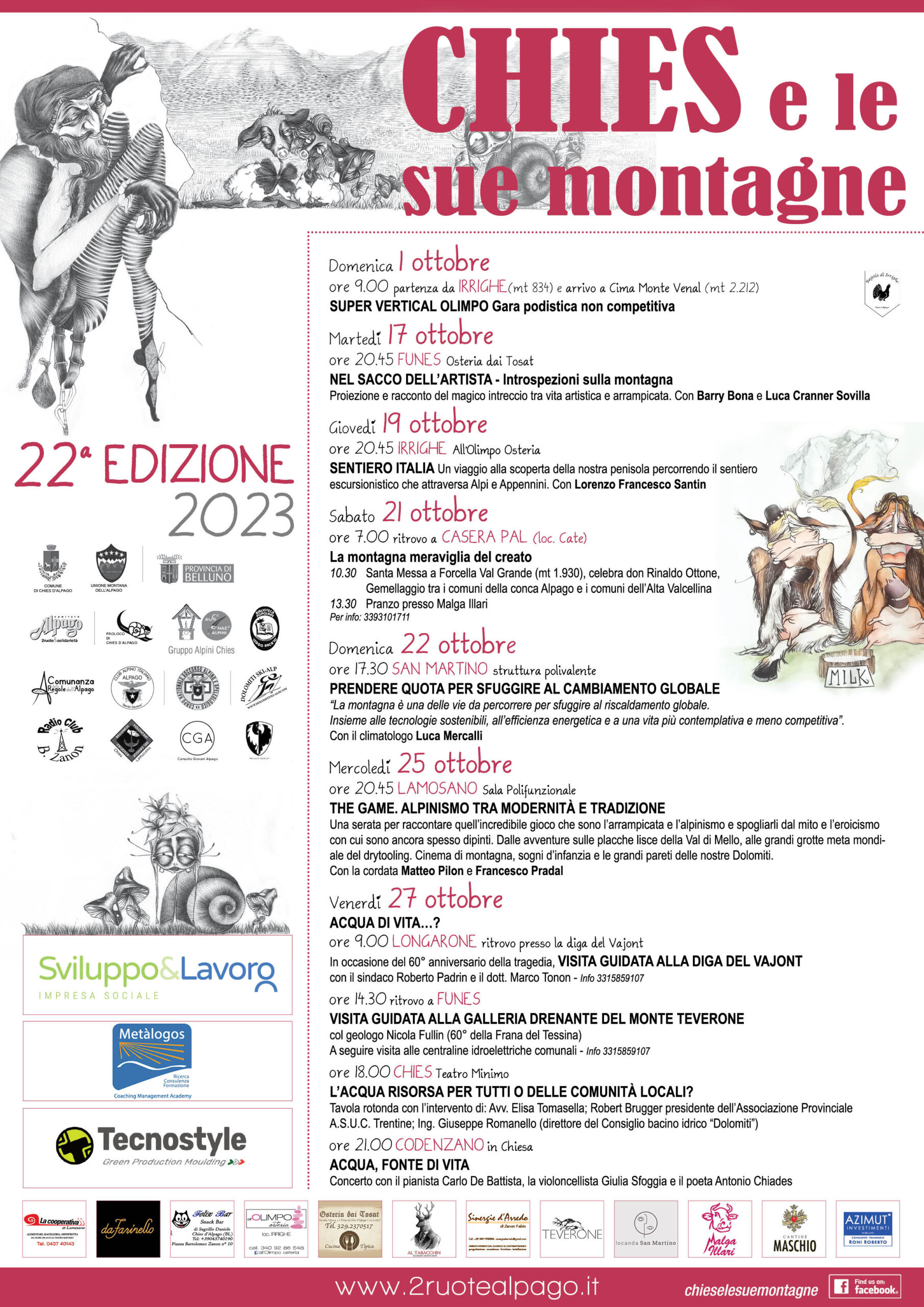 (Corriere delle Alpi 14.10.2023 – di Ezio Franceschini) Ritorno alla verticalità e alle origini per la 22ª edizione di Chies e le sue montagne. Dal 17 al 27 ottobre la rassegna culturale che caratterizza l’autunno a Chies d’Alpago, mette nuovamente in primo piano l’arrampicata e i suoi protagonisti, ma affronta anche altri temi sensibili che riguardano la montagna e chi la vive e la cura, come quello della produzione dell’acqua.