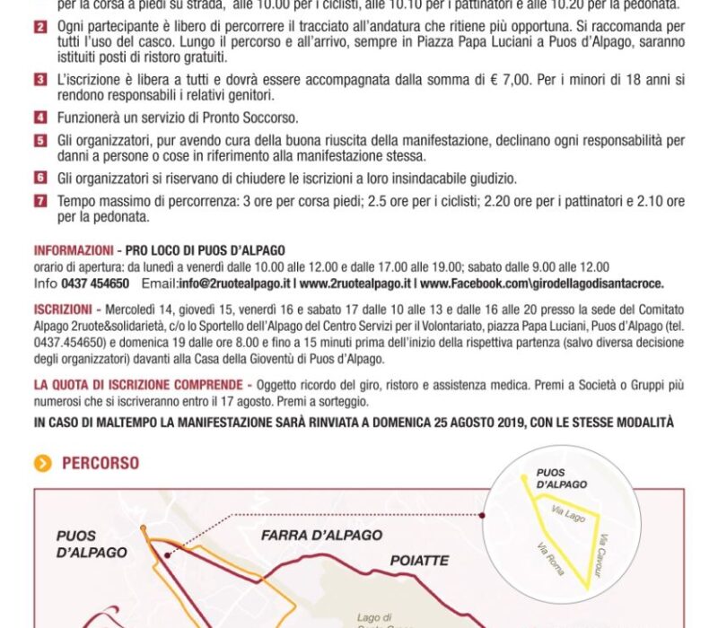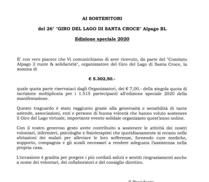 L'edizione 2019 del Giro del Lago di Santa Croce ha consentito di versare la cifra di 17.671,50 euro all'associazione "Cucchini" di Belluno.