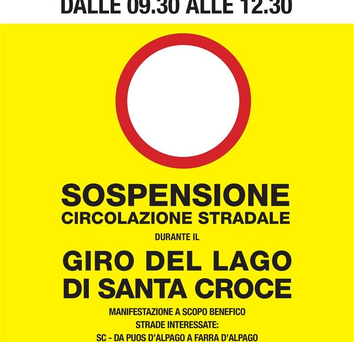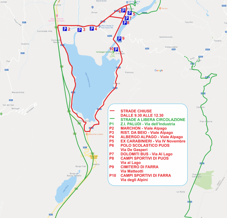 La mappa stradale sotto riportata (scaricabile in pdf CLICCANDO QUI) evidenzia in ROSSO le strade chiuse al traffico per l'intera durata del Giro del Lago di Santa Croce (dalle 9.30 alle 12.30), mentre in VERDE le vie alternative per raggiungere Ponte