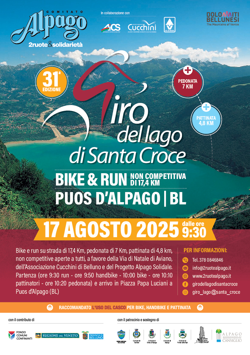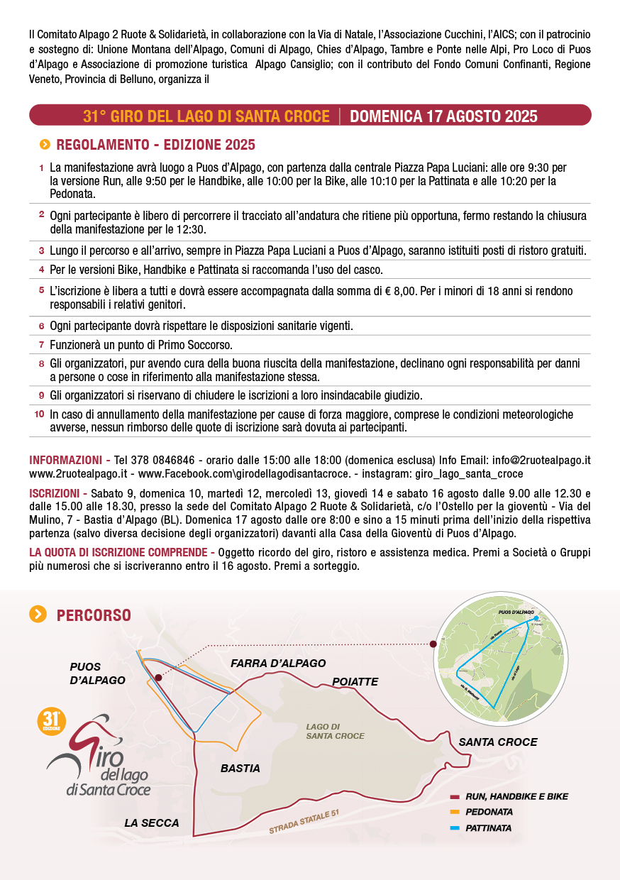 Di seguito trovi i materiali prodotti per il Giro del Lago di Santa Croce 2025, unitamente ad utili indicazione per meglio fruire la manifestazione. Basterà cliccare sul link d’interesse.